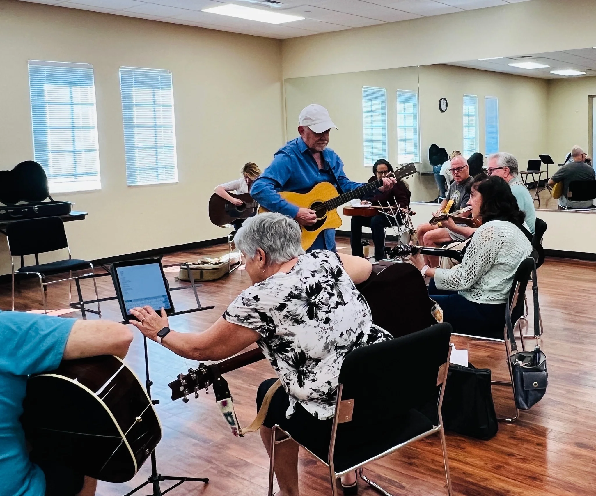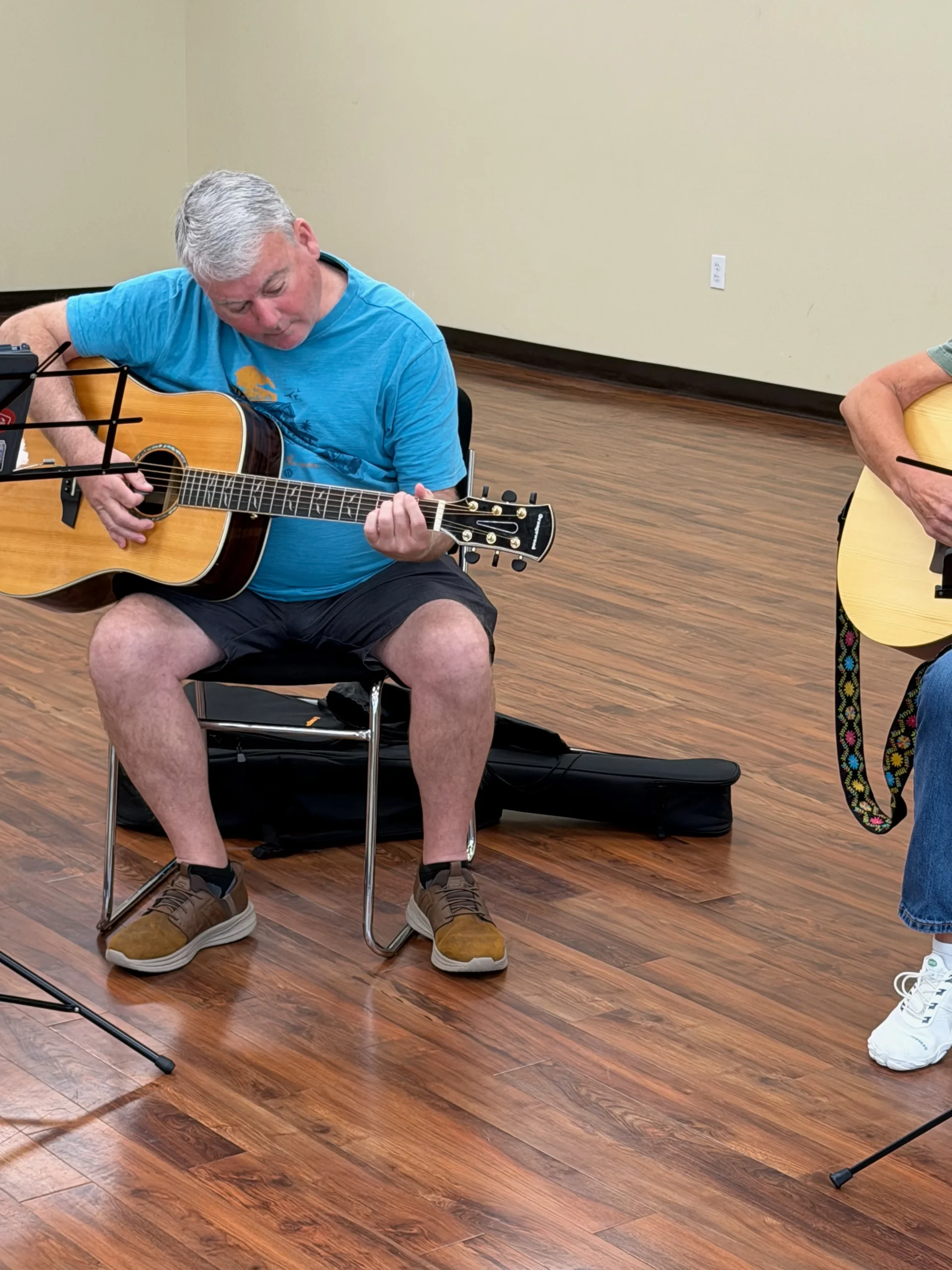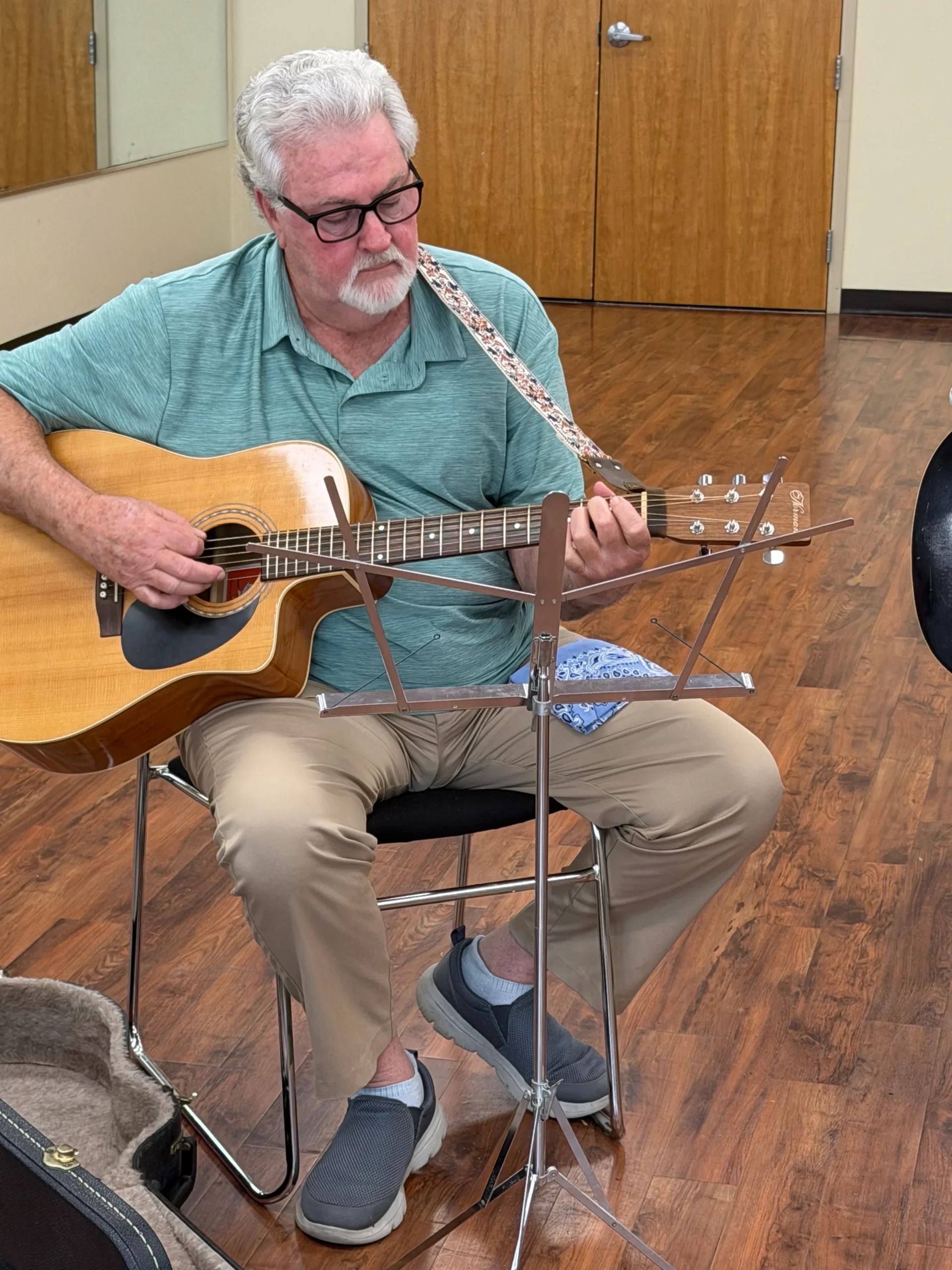 He’s been playing for over 60 years, has toured as a working musician, and later studied how adults learn (andragogy), which shaped how he teaches today.